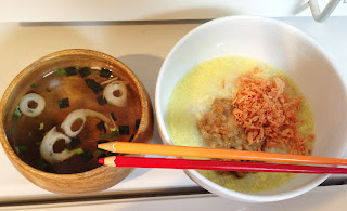 おかゆしか食べてないので、夜はかなり腹が減って、玉子かゆに鮭のほぐしを加える。